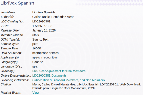 Today was published the Librivox Spanish Corpus by the Linguistic Data Consortium. It is a corpus with a size of 73 hours of clean speech taken from the audio-books of the LibriVox Proyect....